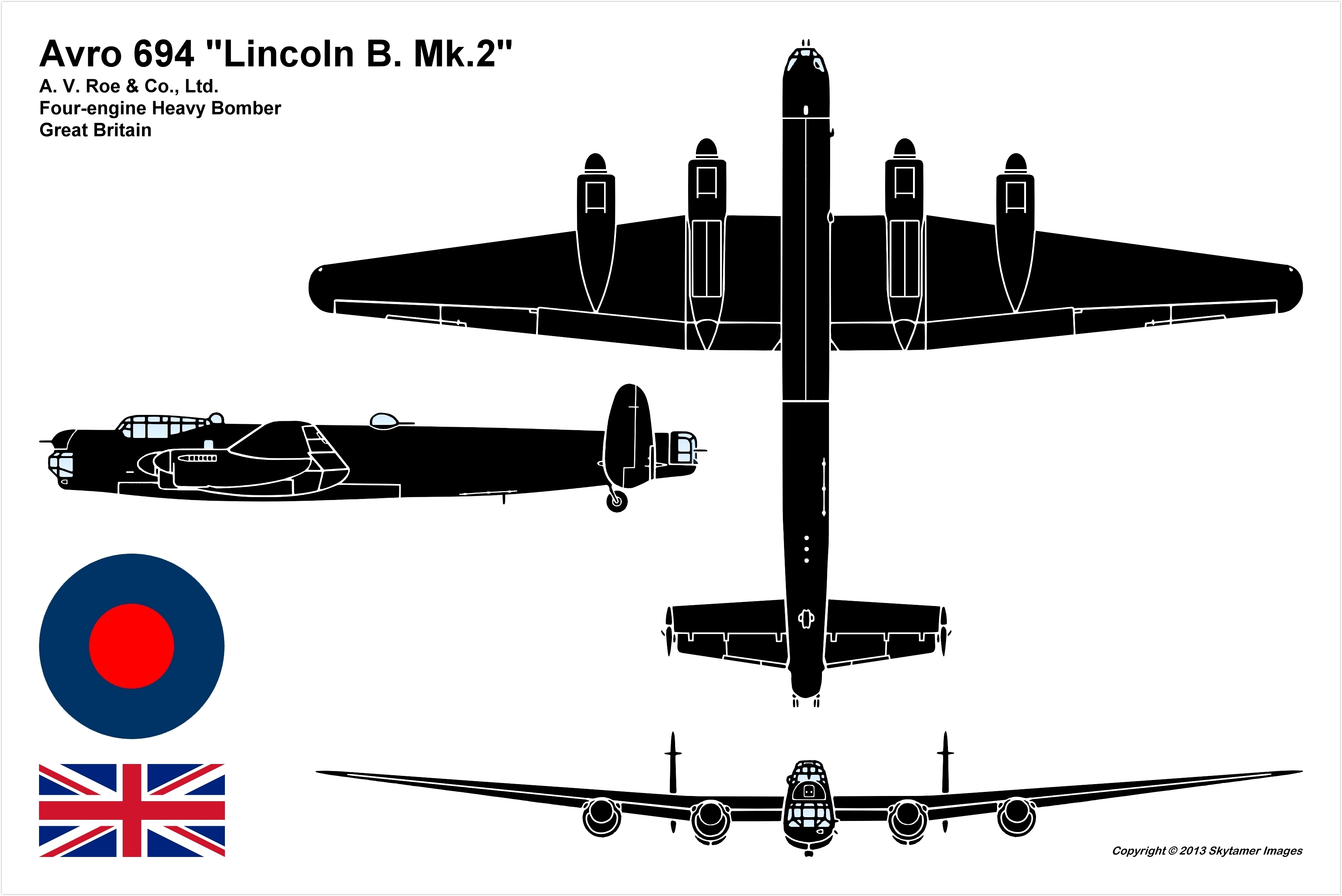 The Avro Lincoln originated from a design produced by Roy Chadwick as a development of the earlier Lancaster bomber which had been produced with the purpose of conforming with the requirements of the Specification B.14/43. Known initially as the Lancaster IV and Lancaster V, the envisioned aircraft, while bearing considerable similarity to the Lancaster, featured numerous improvements, such as the adoption of stronger, longer span, higher aspect ratio (10.30 compared with 8.02) wings along with two-stage supercharged Rolls-Royce Merlin 85 engines fitted within Universal Power Plant (UPP) installations. The new bomber also possessed an enlarged fuselage that accommodated increased fuel and bomb loads and allowed up to 11 tons of various armaments and equipment fittings including the Grand Slam bomb to be carried. It had a higher operational ceiling and longer range than its Lancaster predecessor, being capable of a maximum altitude of 35,000 ft (6.6 mi; 11 km) and a maximum range of 4,450 miles (7,160 km)..