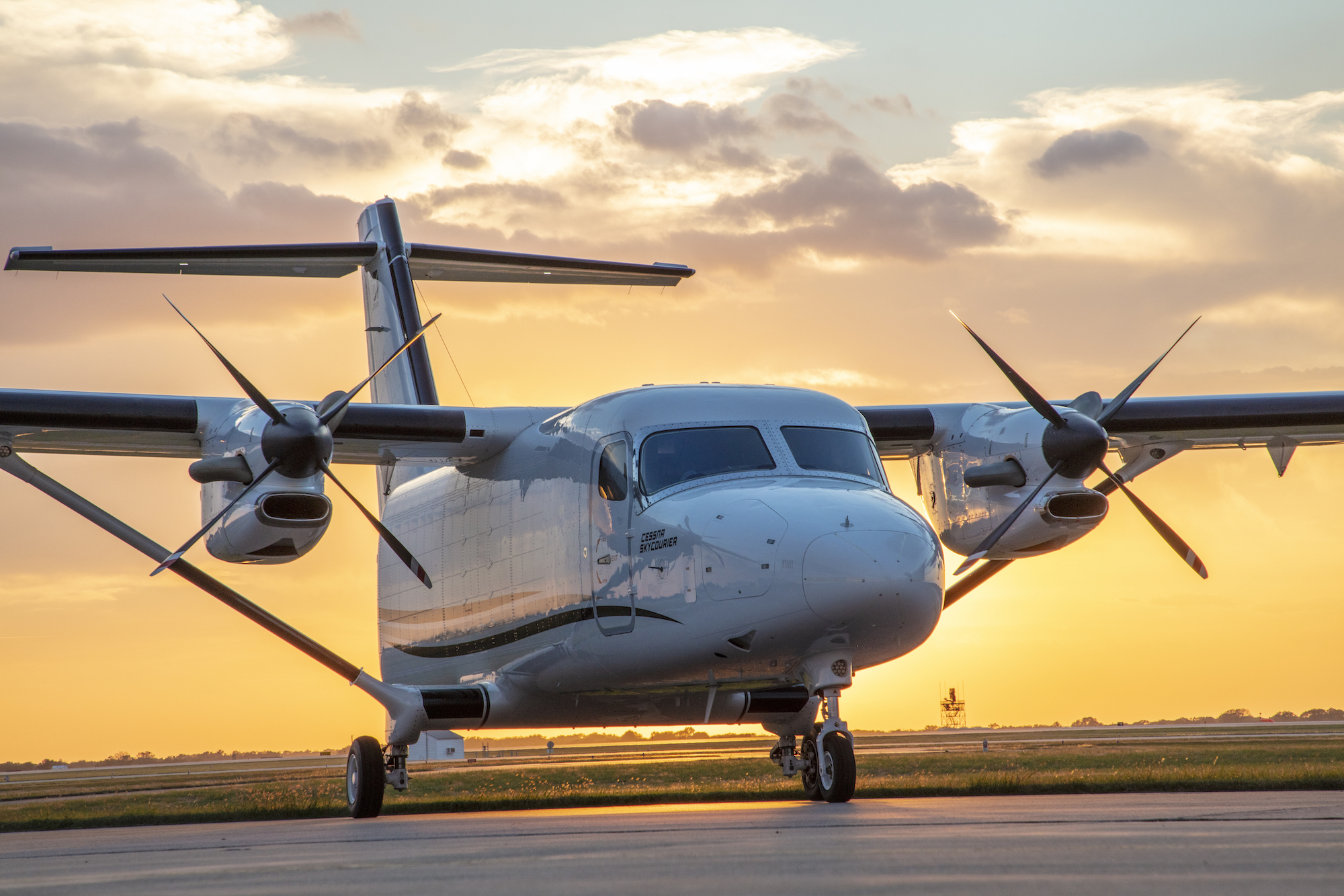 The SkyCourier is a twin-turboprop, high-wing, utility aircraft. It will be available in a 19-passenger variant with large cabin windows and separate crew and passenger doors, or in a cargo variant sized for three LD3s and 6,000 lb (2,700 kg) of payload, featuring a "large cargo door and a flat floor cabin". It will cruise up to 200 kn (370 km/h; 230 mph), with a maximum range of 900 nmi (1,700 km; 1,000 mi). Single-point refueling will speed turnarounds.