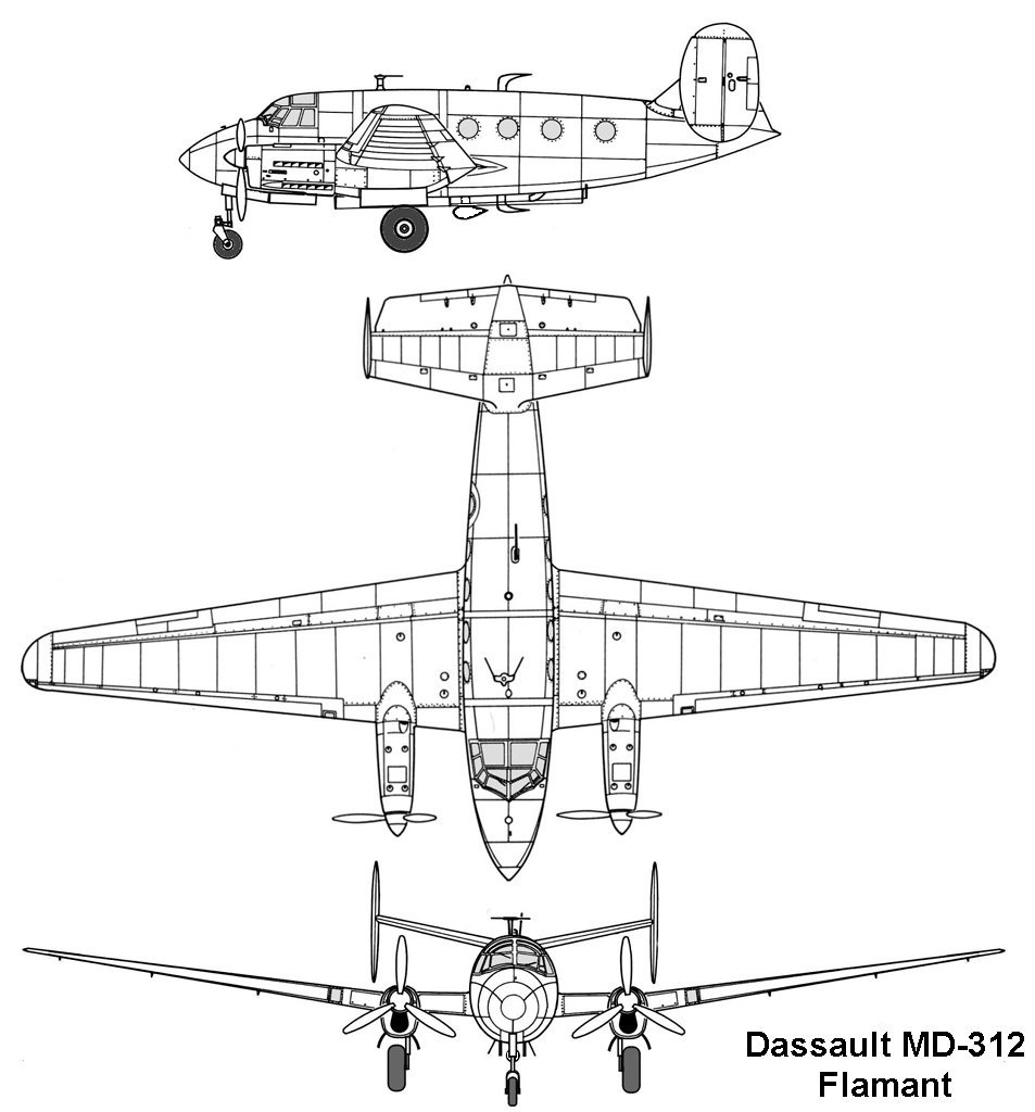 Design work on a twin-engined light transport started in 1946 with the MD 303, a development of an earlier project for an eight-seat communications aircraft, the Marcel Bloch MB-30. The prototype MD 303 first flew on 26 February 1947 powered by two Béarn 6D engines, designed to meet a French Air Force requirement for a colonial communications aircraft. A re-engined version was ordered into production at the new Dassault factory at Bordeaux-Mérignac. The production aircraft was a low-wing monoplane with twin tail surfaces and a tricycle undercarriage, powered by two Renault 12S piston engines.The Dassault MD 315 Flamant is a French light twin-engined transport airplane built shortly after World War II by Dassault Aviation for the French Air Force..