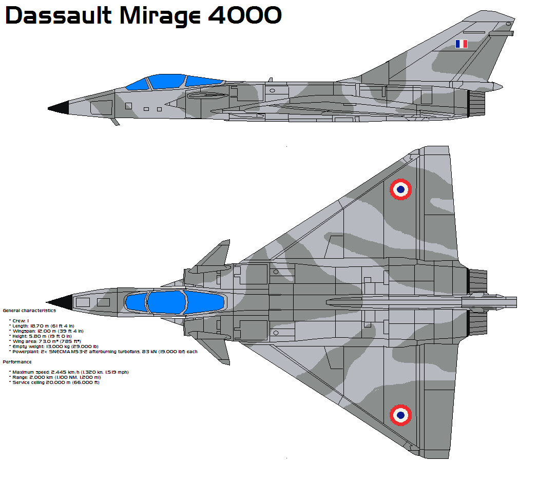 The Mirage 4000 first flew on 9 March 1979. It was financed as a private venture by Dassault.The Mirage 4000 was comparable in size to the United States F-15 Eagle, and was designed to be both a long-range interceptor and a fighter-bomber.