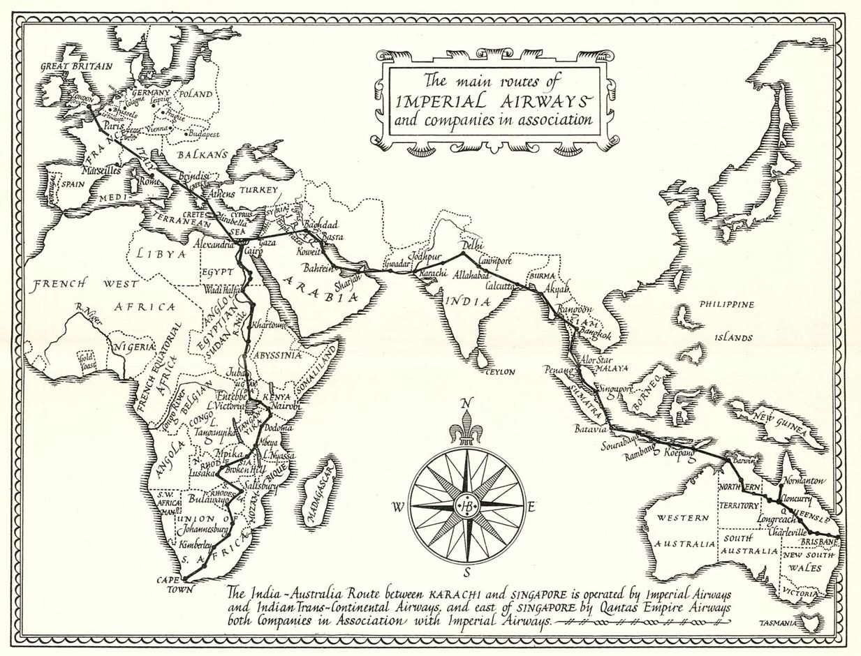 April 1935 map showing Imperial Airways'Air routes between England, India, Australia and South Africa