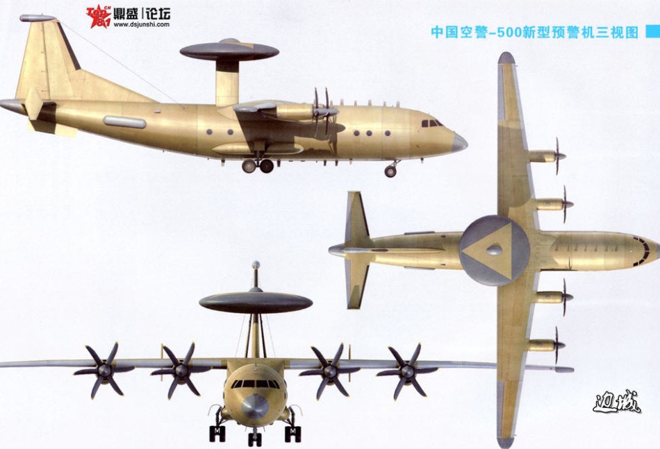The aircraft carries a fixed dorsal radome containing three AESA radar arrays for 360-degree coverage and is said to be more efficient than the two-planar 'balance beam' array design used on the earlier KJ-200.